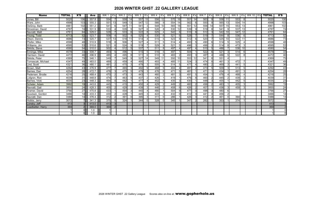 The 2026 Winter 22 Gallery League started Monday, January 12th, 2026.  The first round starts at 4:30PM. The 22 Gallery League will also shoot on Tuesdays at 4:00PM.  See League calendar for the current schedule.
